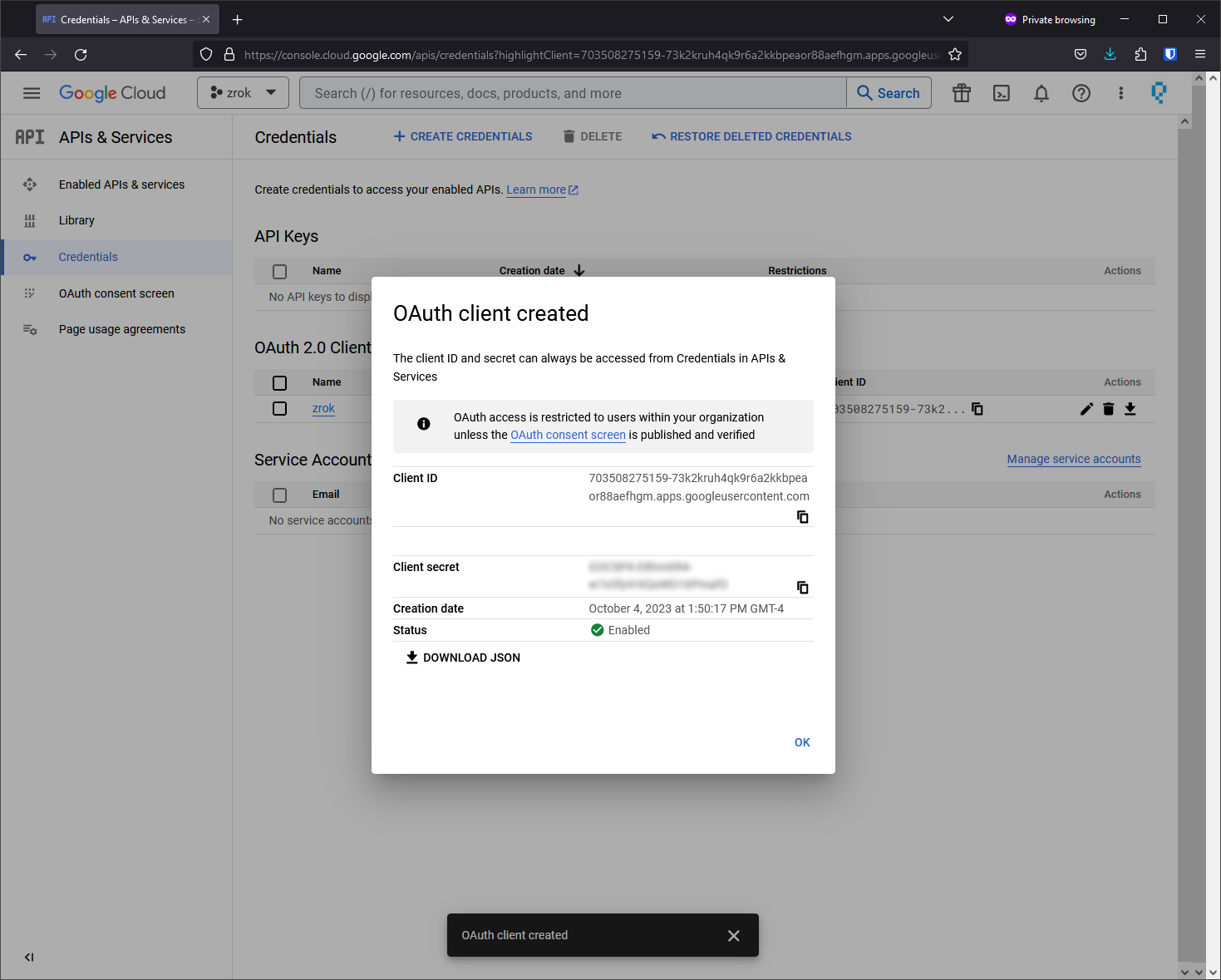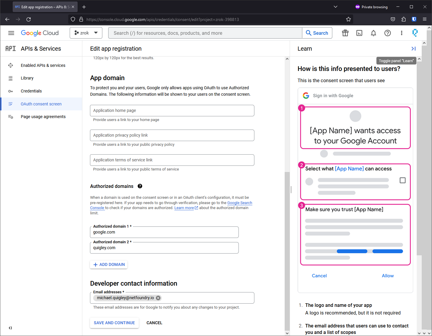 Add the ../auth/userinfo.email scope (required for zrok to receive user email addresses):
